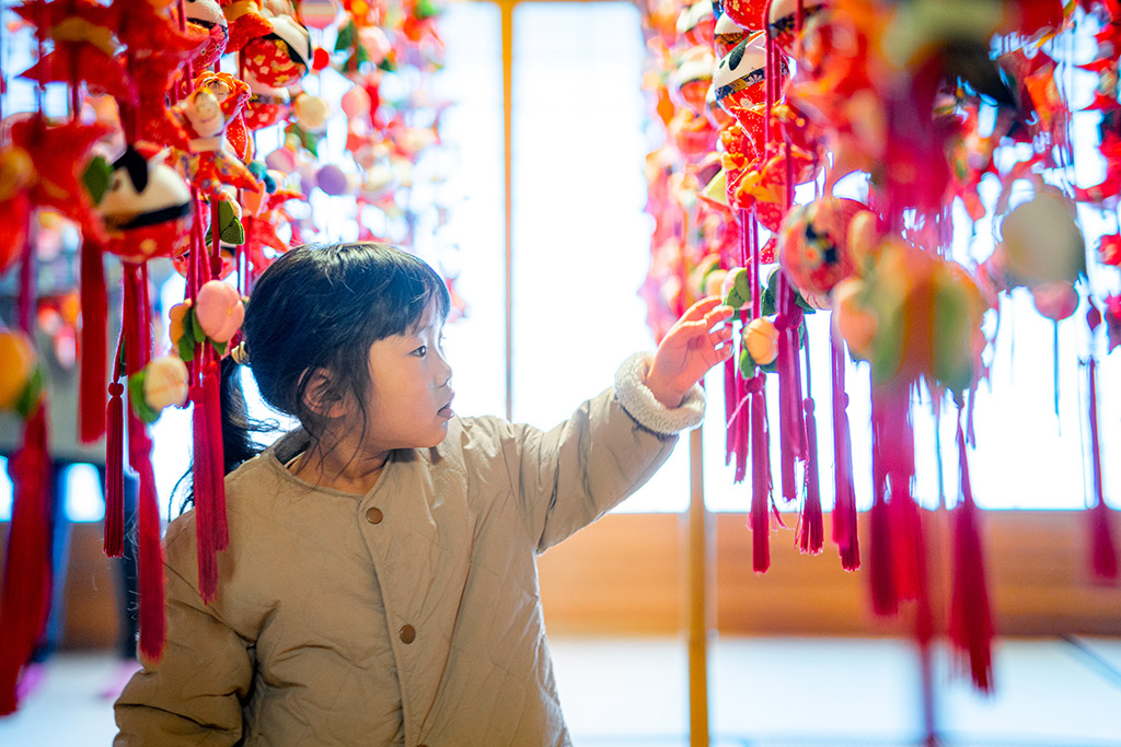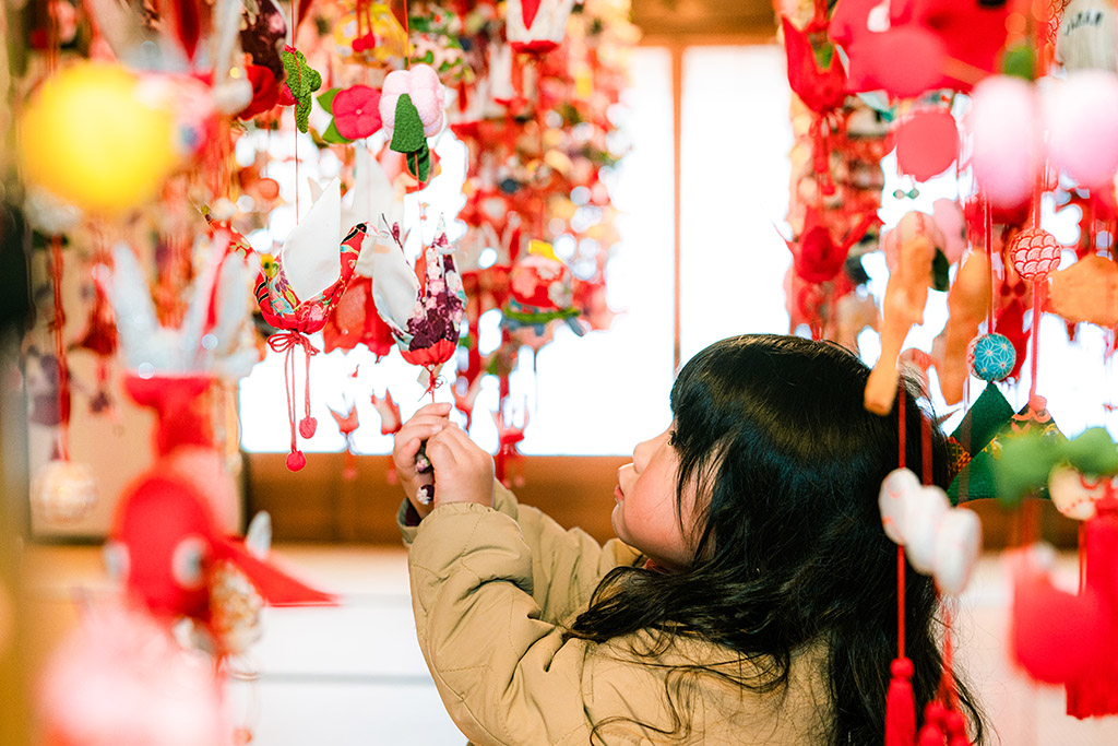 つるし雛は、雛人形と違い様々な種類の人形があり、それを階段に並べていくのではなく、天井からまとめてつるして飾ります。