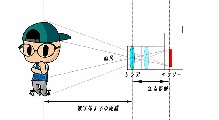 焦点距離が長いとが画角は狭くなり、焦点距離が短いと画角は広くなります。