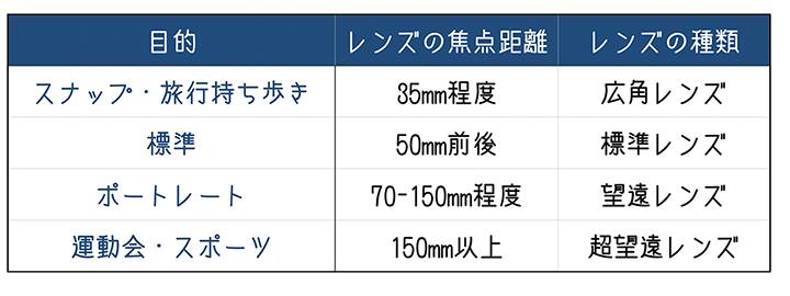 画角やボケ方を考慮して、レンズの焦点距離を選ぶ必要があります。