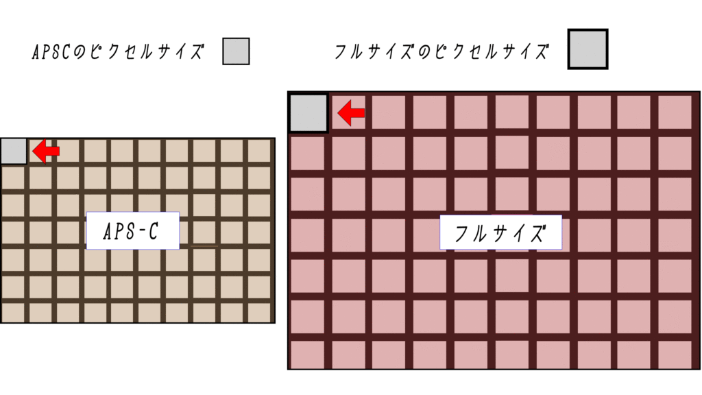 全体の光の量が同でも、一つ一つのピクセルで光を取り込んでいるので、そのピクセルの大きさが大きければ大きいほどそのピクセルは多くの光を取り込みます。感度はピクセルあたりの光の量に左右されるため、なるべく大きくすることで高感度になるということです。