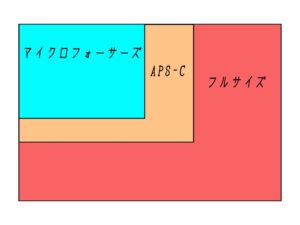 ではそのセンサーサイズですが、基準となる大きさがあります。アナログカメラで一般的に使われていたフィルムサイズ(35mmフィルム)と同じ大きさになるフルサイズ(36mm×24mm)です。それを基準に一般的に使われているサイズがAPS-Cサイズ(24mm×16mm)、マイクロフォーサーズ(17.3mm×13mm)などになります。